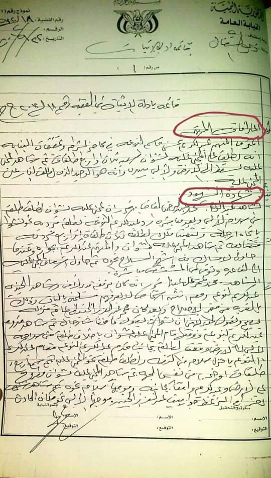 الوثيقة تشير في مطلعها إلى أن "المتهم عبدالكريم محسن النوعة اعترف في محاضر الشرطة وتحقيقات النيابة أنه أطلق على المجني عليه نشوان سعيد ثلاث أو أربع طلقات ثم شاهد المجني عليه يسقط إلى الأرض، وأنه الوحيد الذي أطلق النار على المجني عليه".
