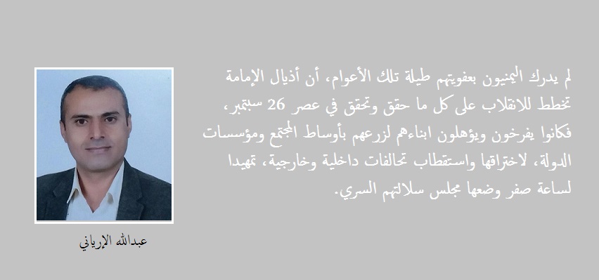 لم يدرك اليمنيون بعفويتهم طيلة تلك الأعوام، ان اذيال الامامة تخطط للانقلاب على كل ما حقق وتحقق في عصر 26 سبتمبر، فكانوا يفرخون ويؤهلون ابناءهم لزرعهم باوساط المجتمع ومؤسسات الدولة، لاختراقها واستقطاب تحالفات داخلية وخارجية، تمهيدا لساعة صفر وضعها مجلس سلالتهم السري.