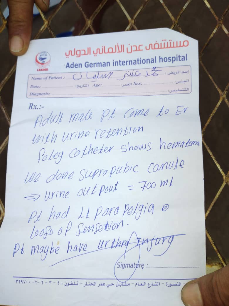 يعاني محمد عنتر من شلل نصفي أقعده عن الحركة بمضاعفات حادث تعرض له في العمود الفقري بينما يعمل في موقع بناء قبل أكثر من عامين، ومنذ ذلك التاريخ خضع لتدخلات جراحية في عدن ولكن تقارير الأطباء تؤكد حاجة محمد لتدخلات ورعاية وإعادة تأهيل في مركز جراحي متخصص خارج اليمن.