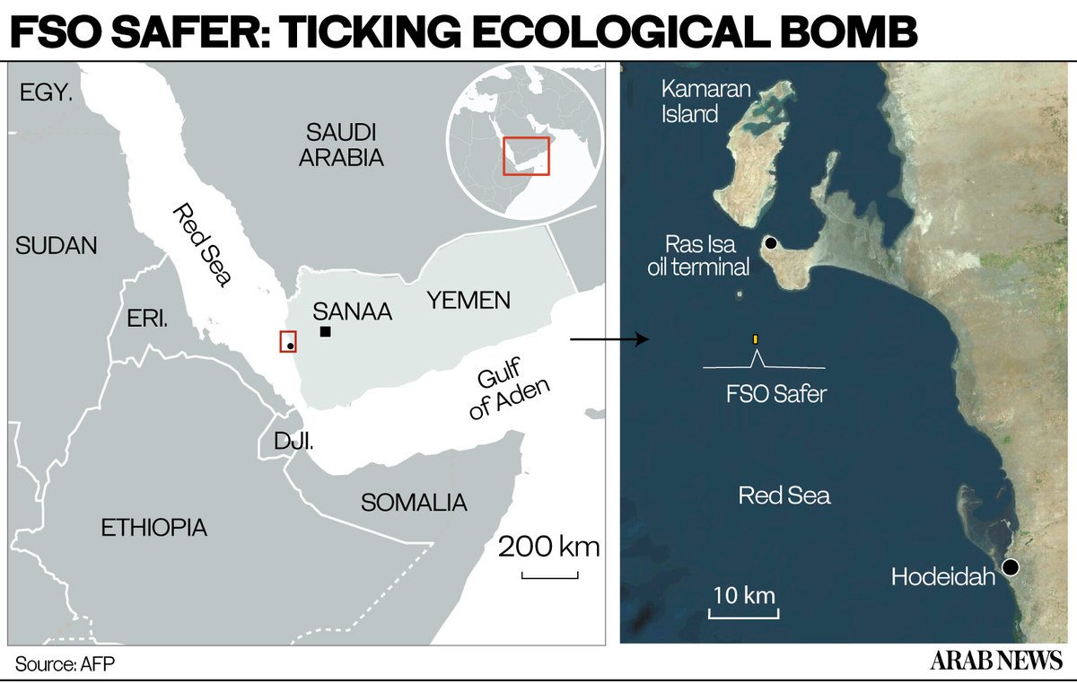 ترسو ناقلة النفط Safer - صافر في البحر الأحمر قبالة الساحل اليمني ، بالقرب من محطة نفط رأس عيسى ، منذ أكثر من خمس سنوات.