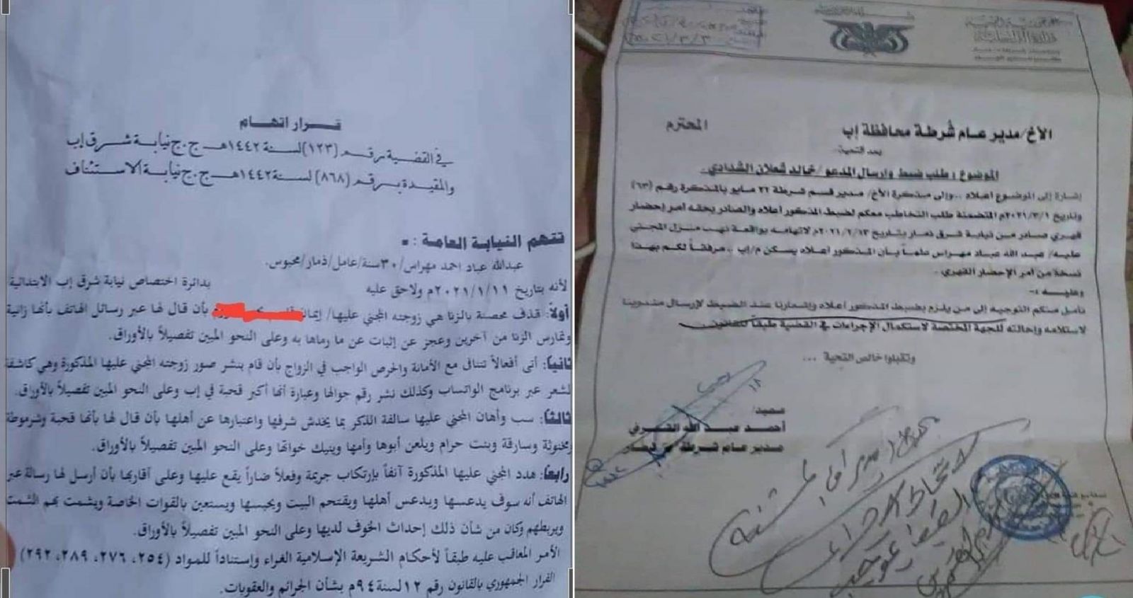 ولذر الرماد على العيون، قامت الجهات الامنية والنيابة بالقبض على الزوج وحررت النيابة قرار الاتهام المرفق وتحويل الزوج إلى القضاء، لكنه ظل يهدد زوجته وأختها وزوج أختها، وفي إحدى رسائله يقول: "انه سوف يجعل القوات الخاصة تقوم بالهجوم على منزلهم ووصل به الأمر بأنه سوف يقوم بحبس زوج أختها وأن لديه نفوذه في ذمار وسلطة وقبيلة ورجال ولا يمكن أن يحبس ذماري بسبب (.....) وسيجعل قبيلته تحبس عديله خالد شعلان، ولن يتم إطلاقه من ذمار إلا بإطلاقه من إب".