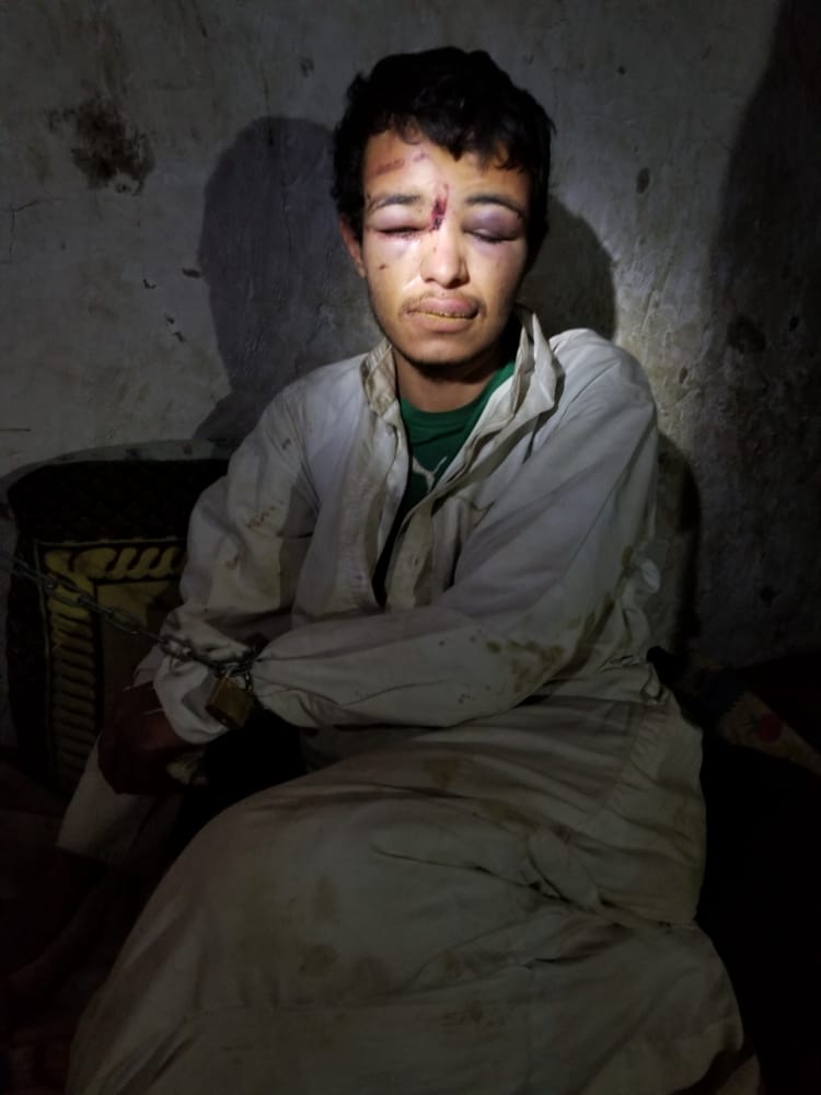 في مكان الاختطاف المجهول تعرض الشاب لصنوف التعذيب، ولم يطلق سراحه إلا وهو فاقد الذاكرة ويعاني من أزمة نفسية حادة. ومع أنه لا يتذكر شيئا مما فعله الحوثيون به، إلا أن جسده الهزيل ووجه المتورّم ويديه المكبلتين بالسلاسل يكفي للكشف عن بشاعة ما حدث.